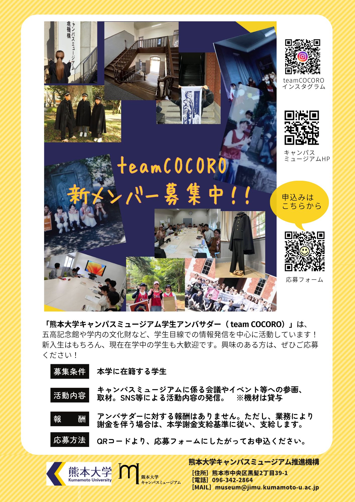 熊本大学の team COCORO は、キャンパスミュージアムの魅力を国内外に発信し、文化と歴史を未来へつなぐ 学生アンバサダー のチームです。五高記念館をはじめとする重要文化財の価値を多くの人に伝えるため、学生ならではのアイデアと情熱を活かして活動しています。