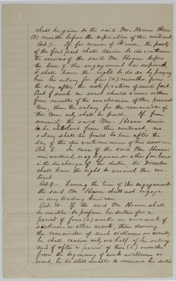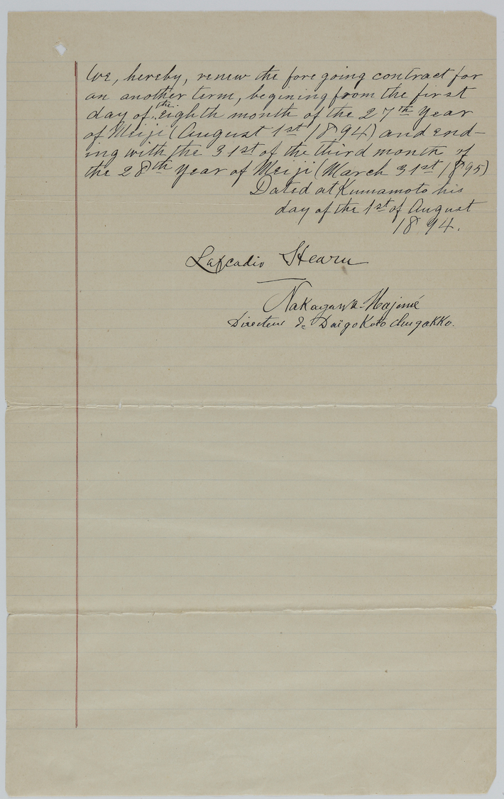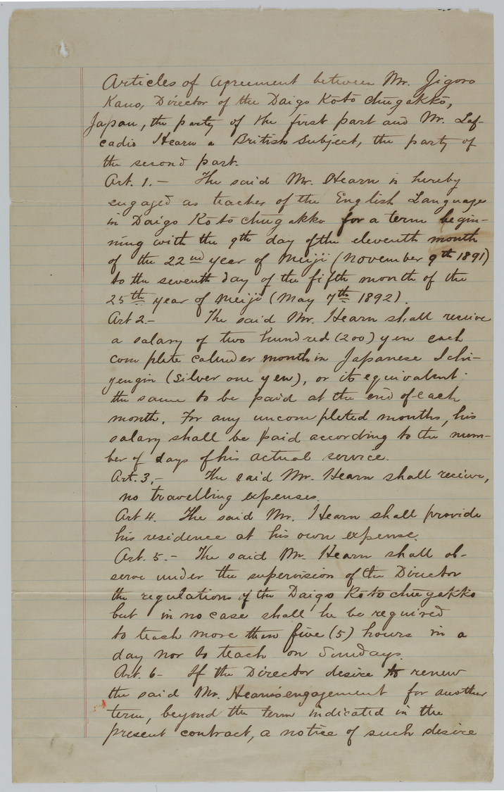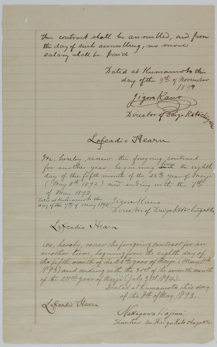 ラフカディオ・ハーン(小泉八雲)と3代校長嘉納治五郎、4代校長中川元の間に交わされた雇用契約書。英文の契約書に双方が署名している。
