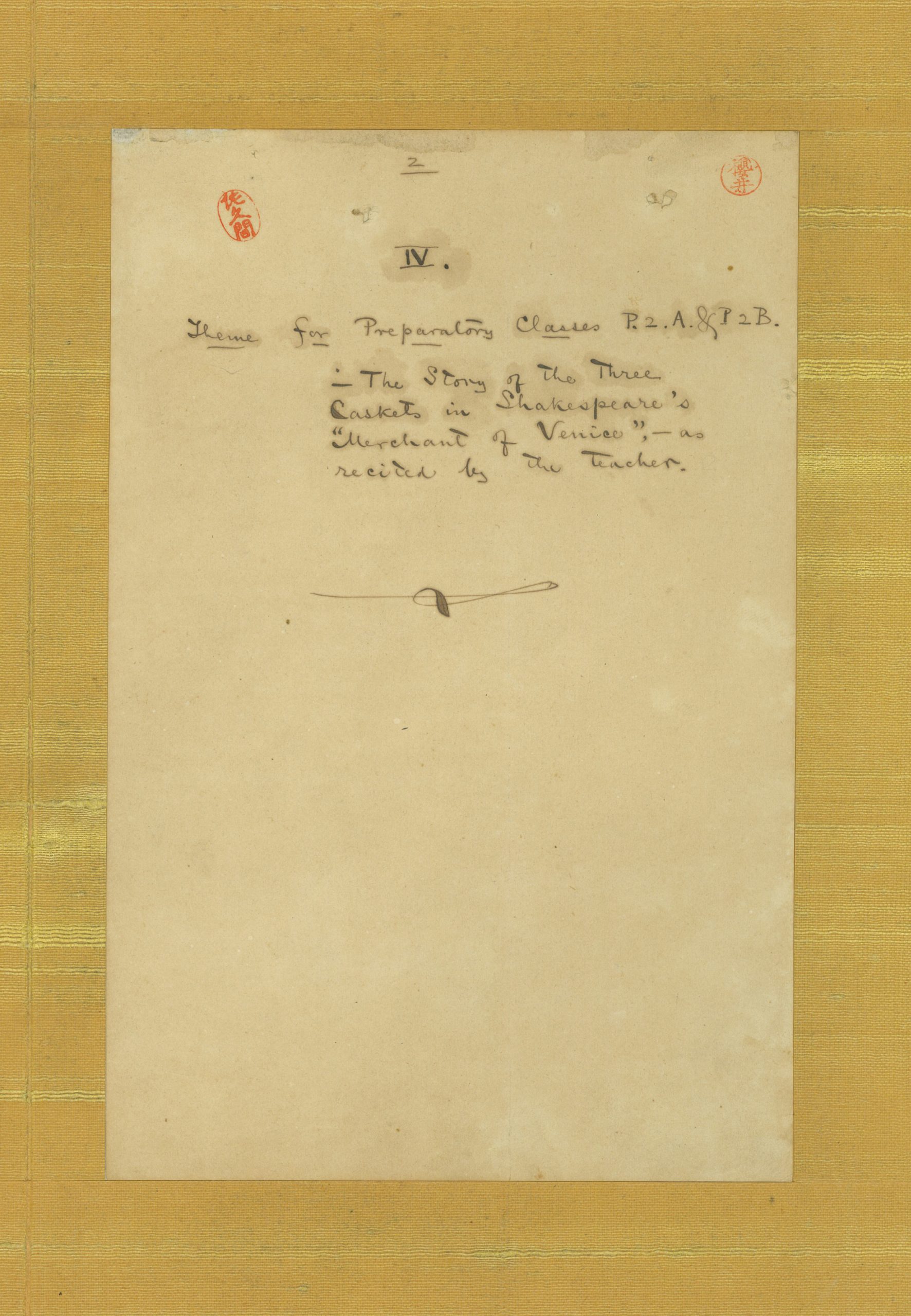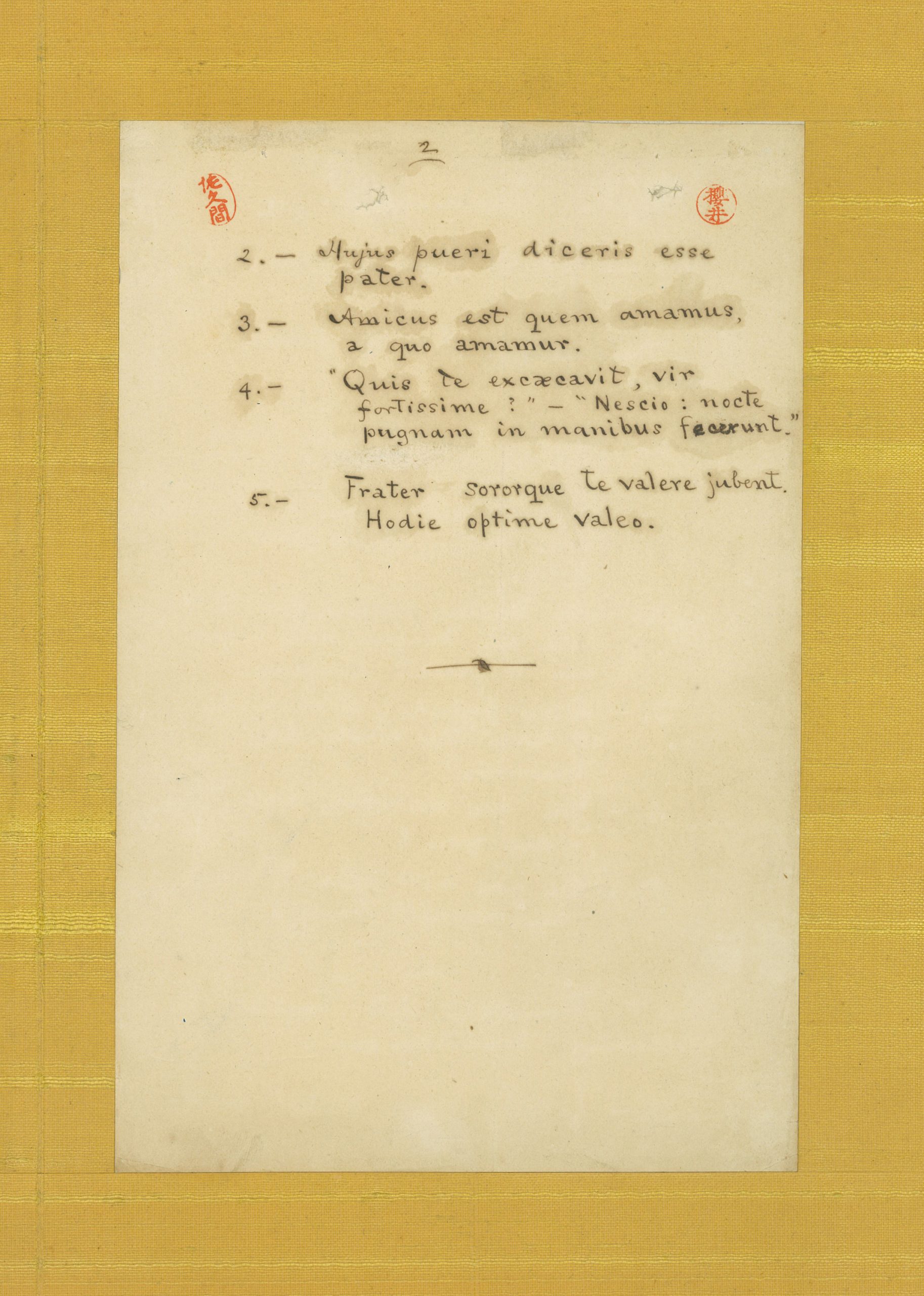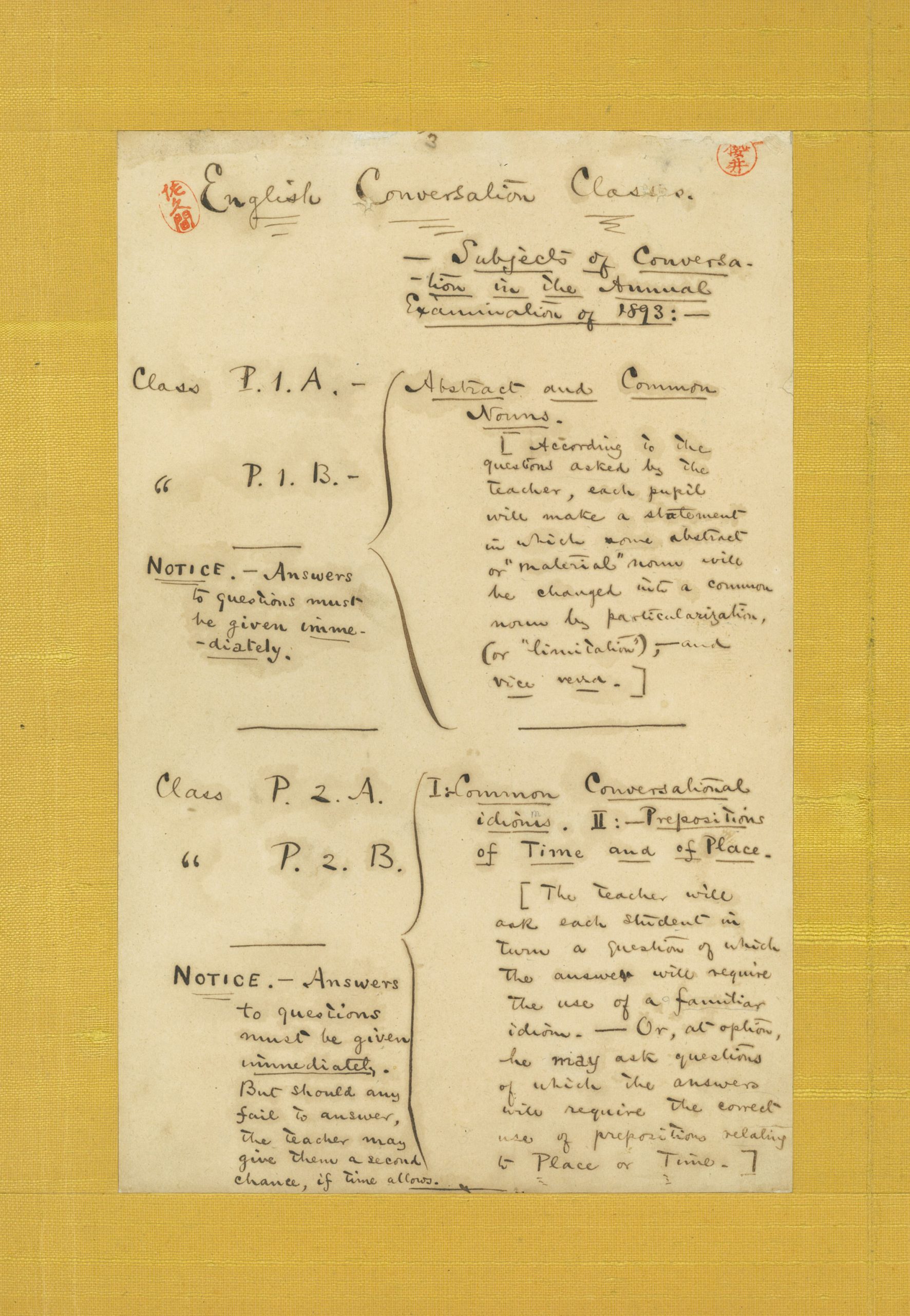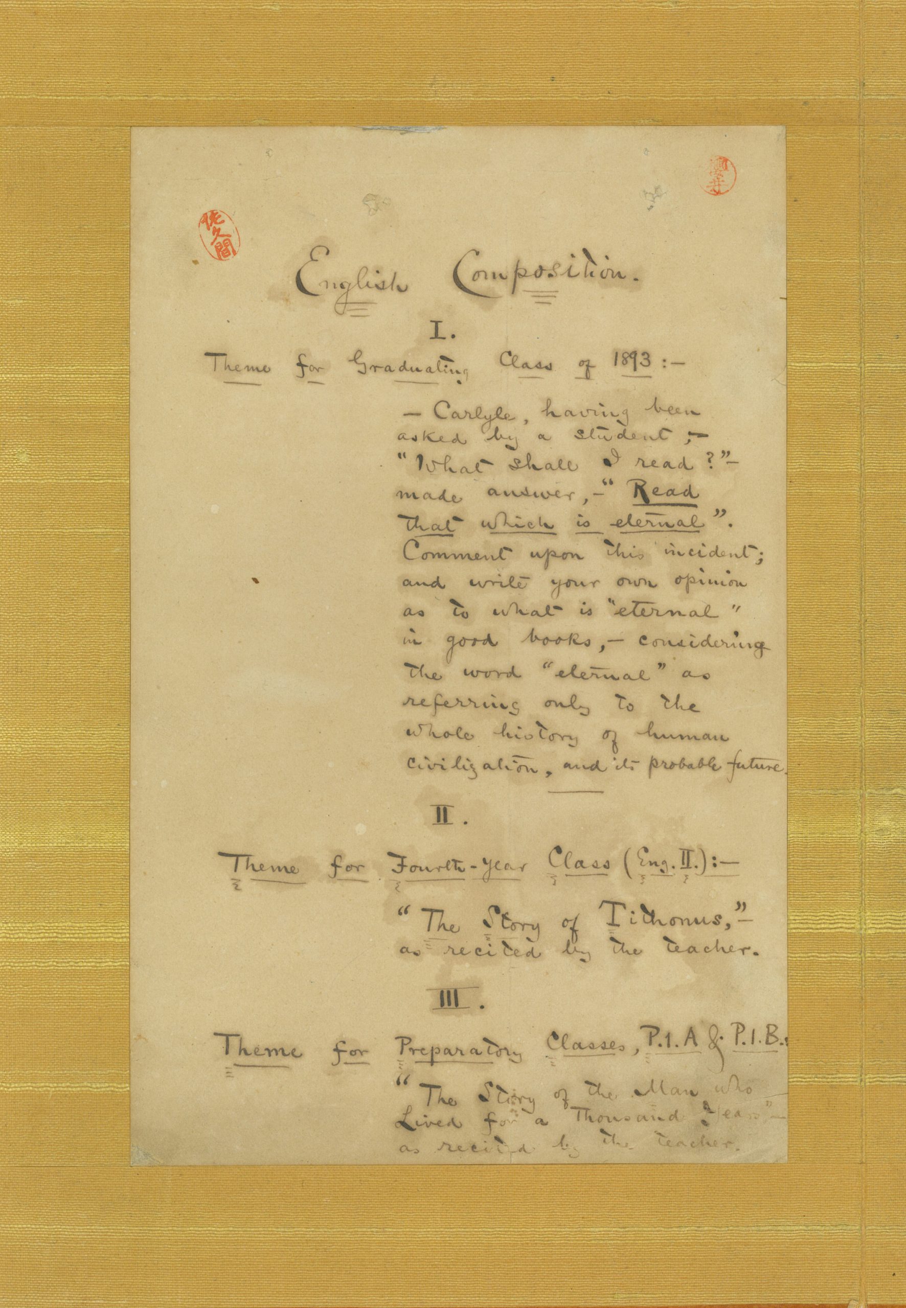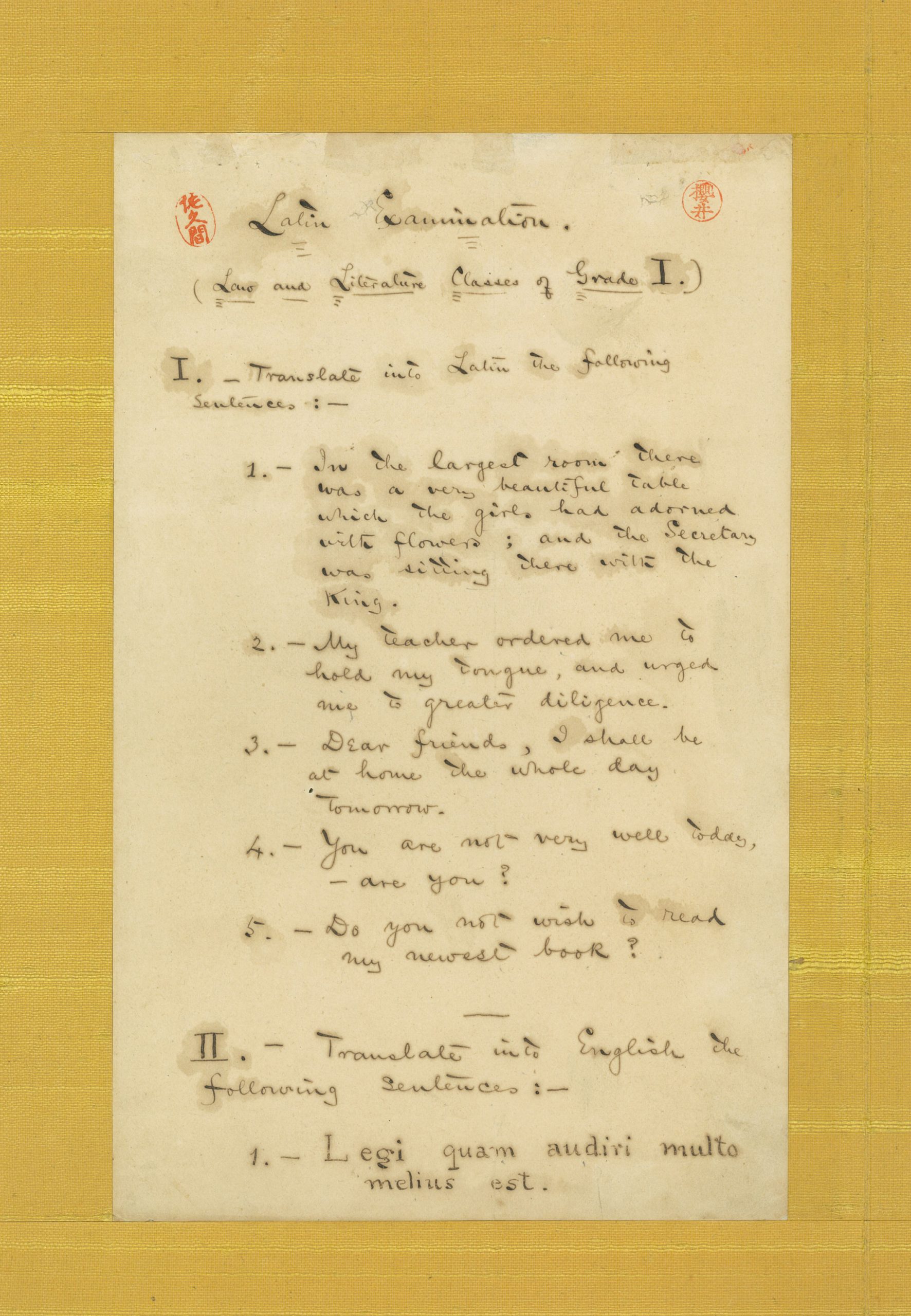 ラフカディオ・ハーン(小泉八雲)が作成した英語とラテン語の試験問題。1893(明治26)年7月に実施された試験のために作成されたと考えられている。それぞれに当時の英語教授 佐久間信恭と教頭 櫻井房記の印が押されている。